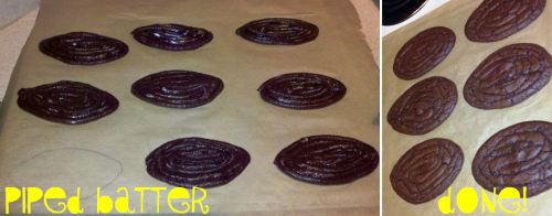 - Pipe the brownie mix to fill in the football shapes (see photo).