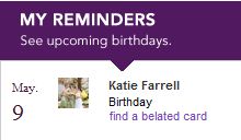 - You can import your Facebook friends and have Treat remind you when their birthdays are! No more forgotten birthdays. You can also select which friends you want to send cards to so you don’t get a reminder for all 1,000 of your friends. When you log in, it will tell you which birthdays are coming up and give you the option to send a card (or, as you’ll see below, send a belated birthday card… Sorry Katie… but Happy Birthday today!)
