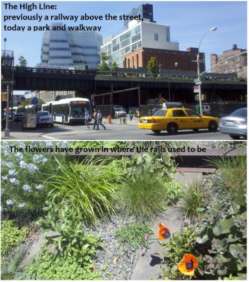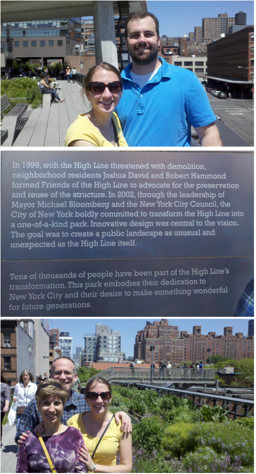 I stayed overnight in my brother’s dorm room Friday night and we woke up early Saturday to pack up his stuff and help him move out of his dorm. We grabbed a quick breakfast at Westside Market (no, not the Cleveland landmark) before meeting up with my parents to pack up his stuff into their rented van. My brother had to work again, so my parents, B and I headed to the High Line to explore the green area on what was turning out to be a gorgeous, 70something degree day. The High Line was beautiful – for you non-NYers, the High Line is a park/walking route in on an old, abandoned above-ground and above the streets train tracks. The tracks are no longer in use, and instead of tearing them down, the city decided to turn the overgrown tracks into a park-like walking area, above the city. There are gorgeous plants, vendors selling food and cute artsy stuff, sprinklers for kids to run through, and more, all along the walkway.