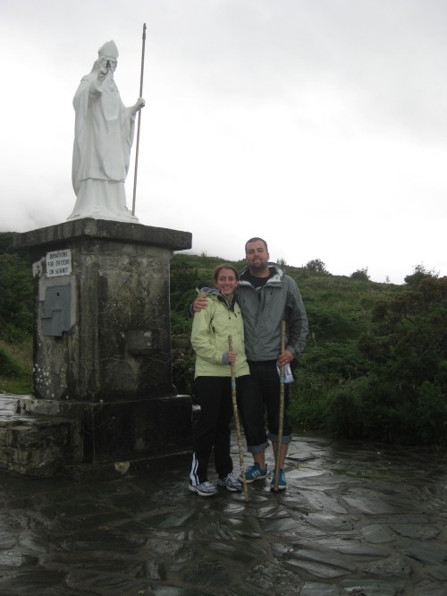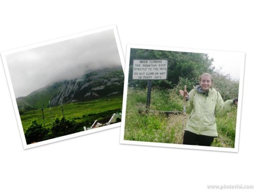 After visiting the grounds and catching the beginning of a free concert by an American choir in the chapel, it was time to head to our next location – Croagh Patrick. I was a little nervous – Croagh Patrick is a large hill that people climb, some barefoot, to get a beautiful view of the Irish countryside. It was the same mountain that St. Patrick supposedly climbed before he chased all the snakes out of Ireland and therefore is the site for many religious pilgrimages. The climb isn’t easy, however, and the weather had turned cold and rainy – not my idea of ideal mountain climbing weather. When we got to the base of the mountain, it was still rainy and so foggy that we couldn’t see the top of the mountain. I kept my fingers crossed, bundled up (pants, sneakers, long sleeved shirt, sweatshirt, windbreaker and gloves for July!), ignored the sign that warned us not to climb in “wet and foggy days,” bought a walking stick and began the ascent.