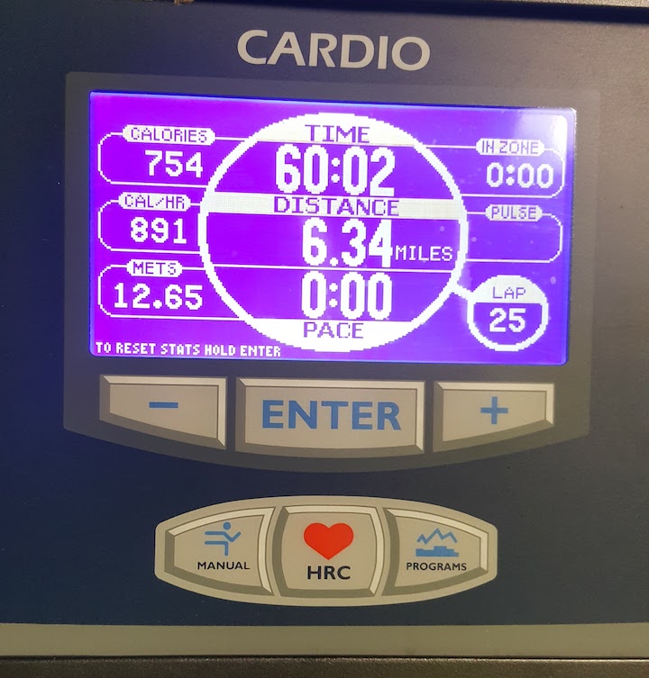 Sunday: 6.7 treadmill miles. I had 6 on the schedule and I ran for 60 minutes and did 6.34 in that time period. I then did a little cool down and ended up at 6.7.