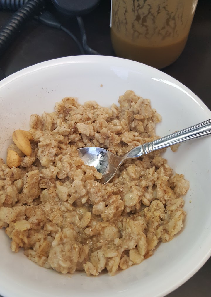I ate breakfast at work – you can see the ugly smoothie in the background (it looked prettier in the Vitamix), along with my egg white brewer’s yeast oats. And a few nuts sprinkled on.