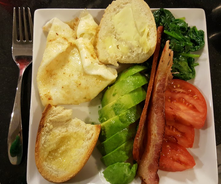 Dinner was brinner! Egg whites, toast, avocado, bacon, tomato and spinach. One of my AVORITE dinners 🙂