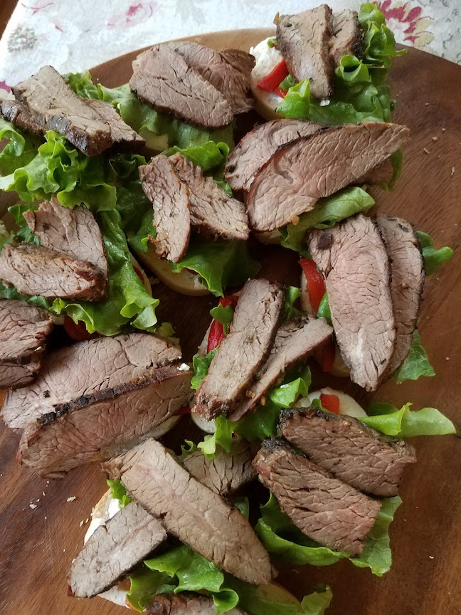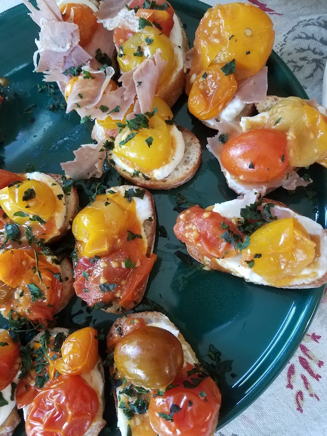 That afternoon, we went over to B’s family’s house for Mother’s Day dinner. We had small plates, a bunch of food that people brought over as a potluck. Some of the goodness included crab cakes, salad, cheese and bread, fruit, shrimp, open-faced steak sandwiches, bruschetta and more!