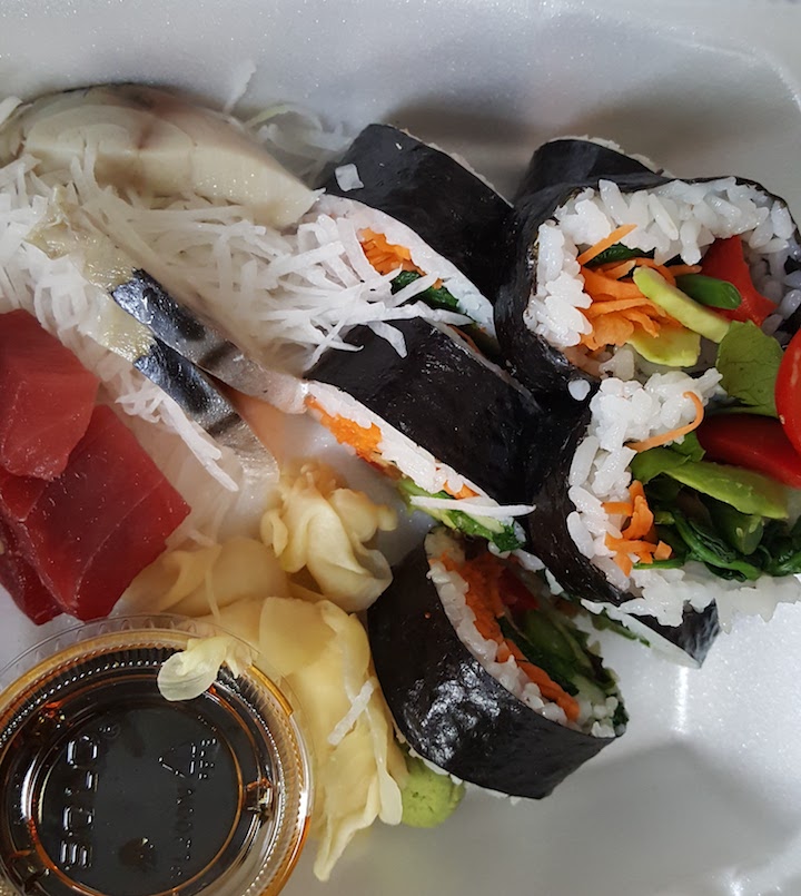 That night, B and I ordered sushi takeout. I had a great veggie roll, seaweed salad, and some sashimi – tuna and mackerel.