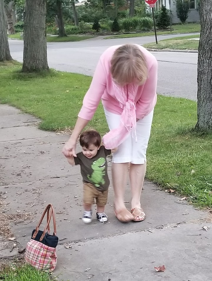 Walks with Grandma. FW still isn’t walking on his own, but he’s close.