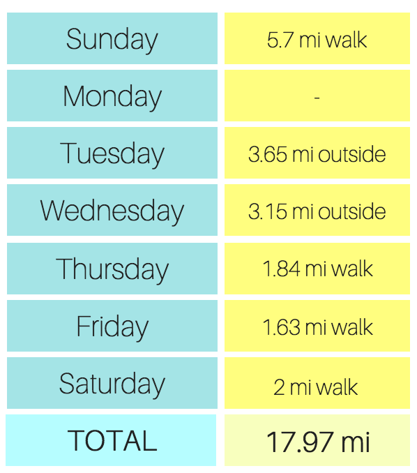 The theme for last week is “ups and downs.” It was one of those weeks that had a few good days (two outdoor runs), but then there were some bad days due to lack of sleep and massive headaches. Here’s where it ended up: