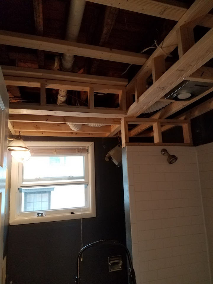 Painted the bathroom. We chose the Sherwin-Williams color SW7732, lemongrass. B picked out new handles for the tub. He also built the wall up behind the shower (you can see the framing above). And, last but not least, a new vanity!