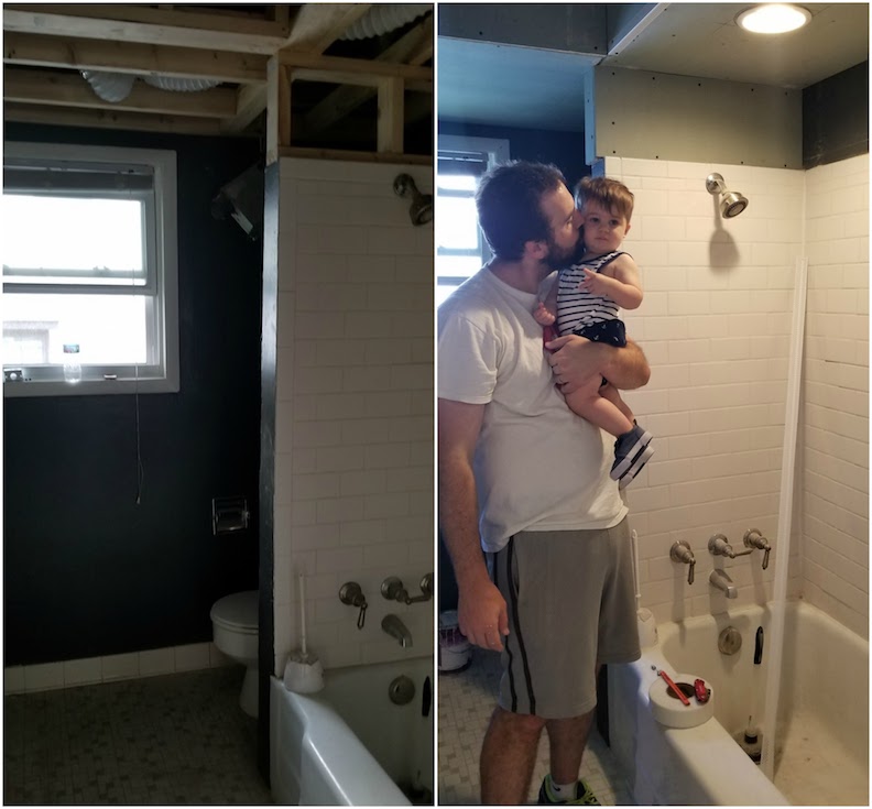 So here’s a before and after shot that shows it still in progress. You can see the wall is built up, the ceiling is in and there’s a new light above the shower. You can also see the original old hot and cold water handles.