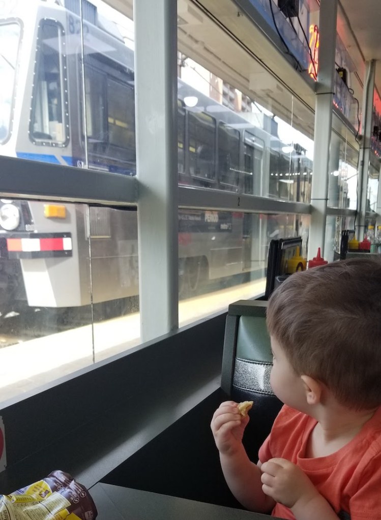 Saturday morning, we walked to the nearby Farmers Market and got breakfast at a diner while we were there. There’s a diner right by where the train stop is and FW loved watching the trains go by.