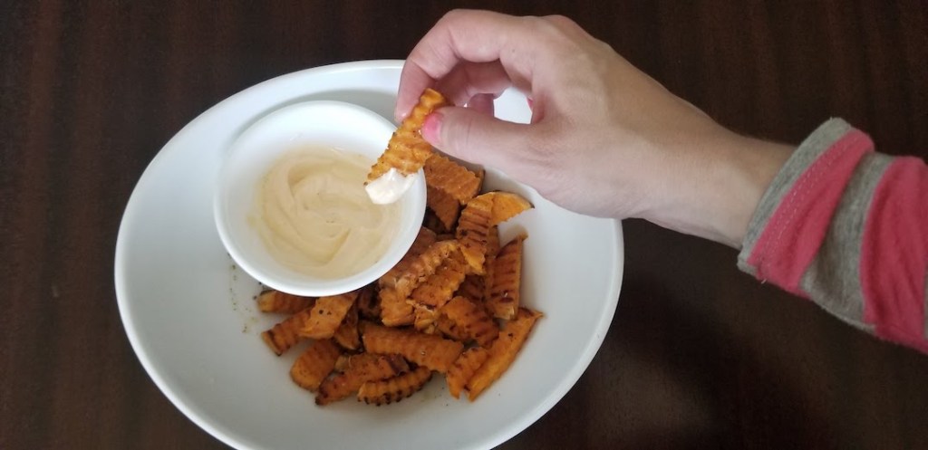 - Slice the sweet potatoes into fry-like shapes. (Here’s the knife I use to get the cute crinkle cut fries) Toss with olive oil.
