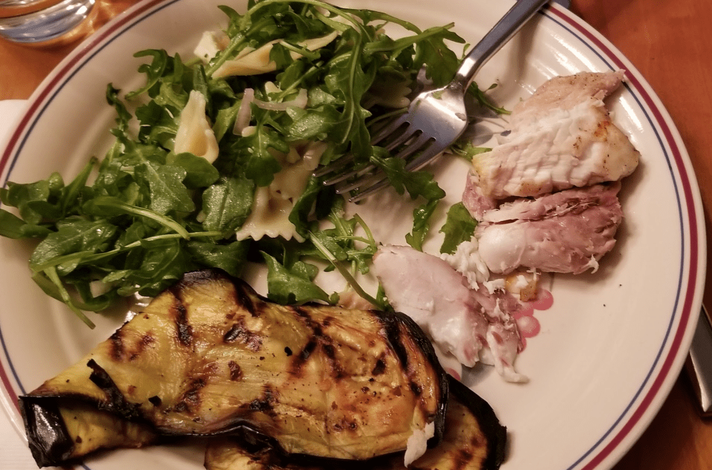 For dinner, we joined B’s family per our Sunday night tradition. B ended up making the whole family dinner and it was delicious – we had two different types of fish, grilled eggplant and an arugula salad.