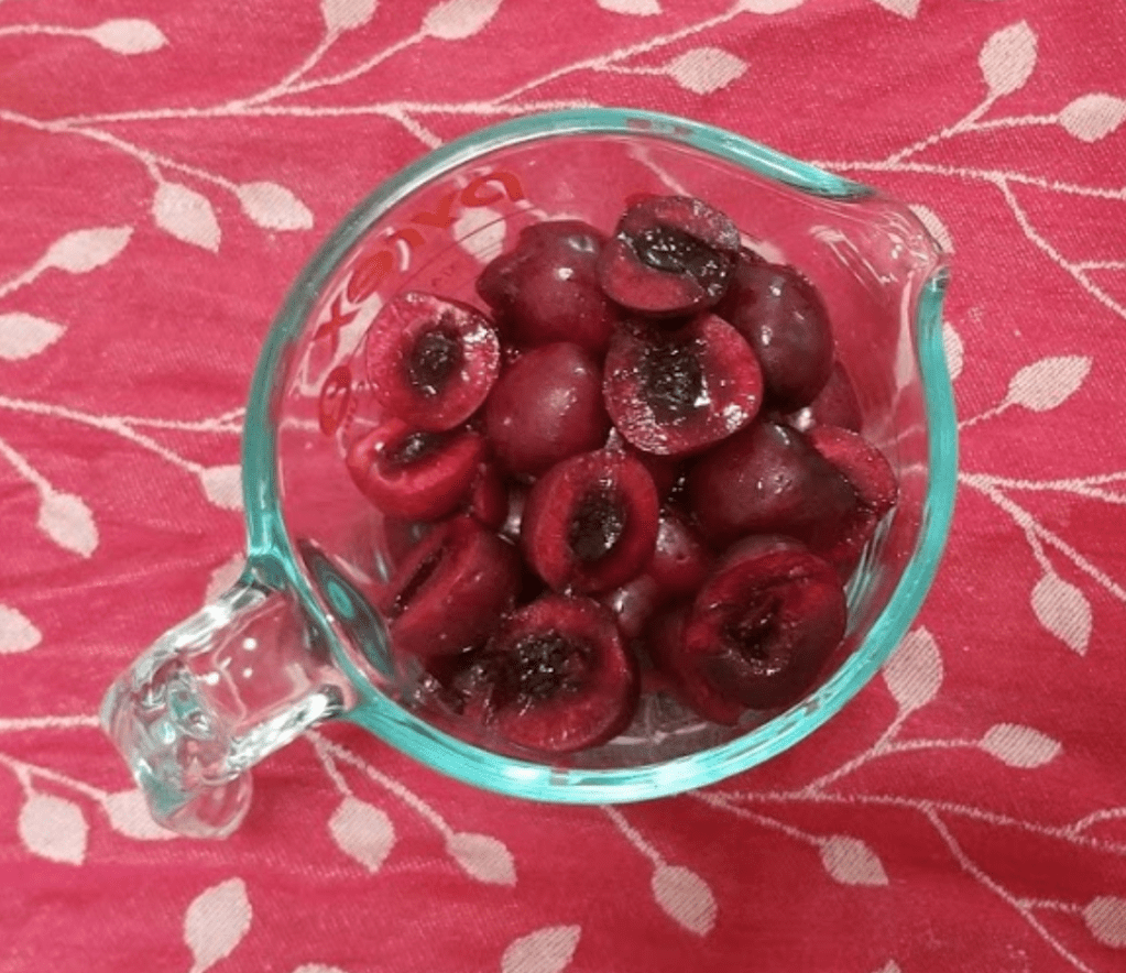 - 1 heaping cup of cherries, pitted and cut in half – I used this to pit the cherries and it works SO much better than doing it by hand!