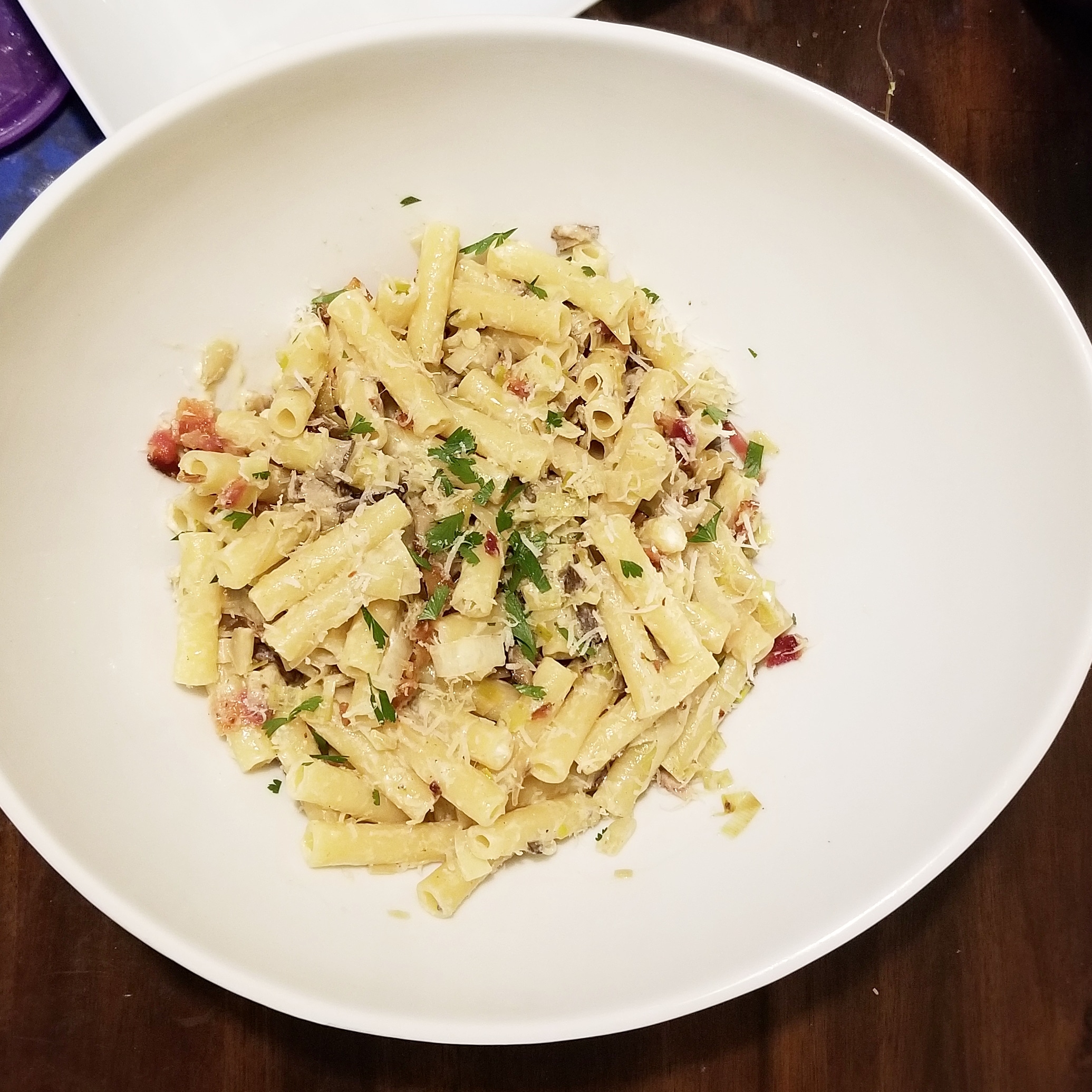 Penne with bacon, leeks and mushrooms.