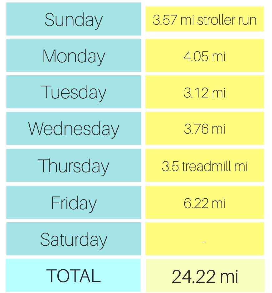 One stroller run, one treadmill run (there were thunderstorms) and mostly outdoors. I am getting so spoiled being able to run outside- I am NOT looking forward to the cold and icy winter that is coming!