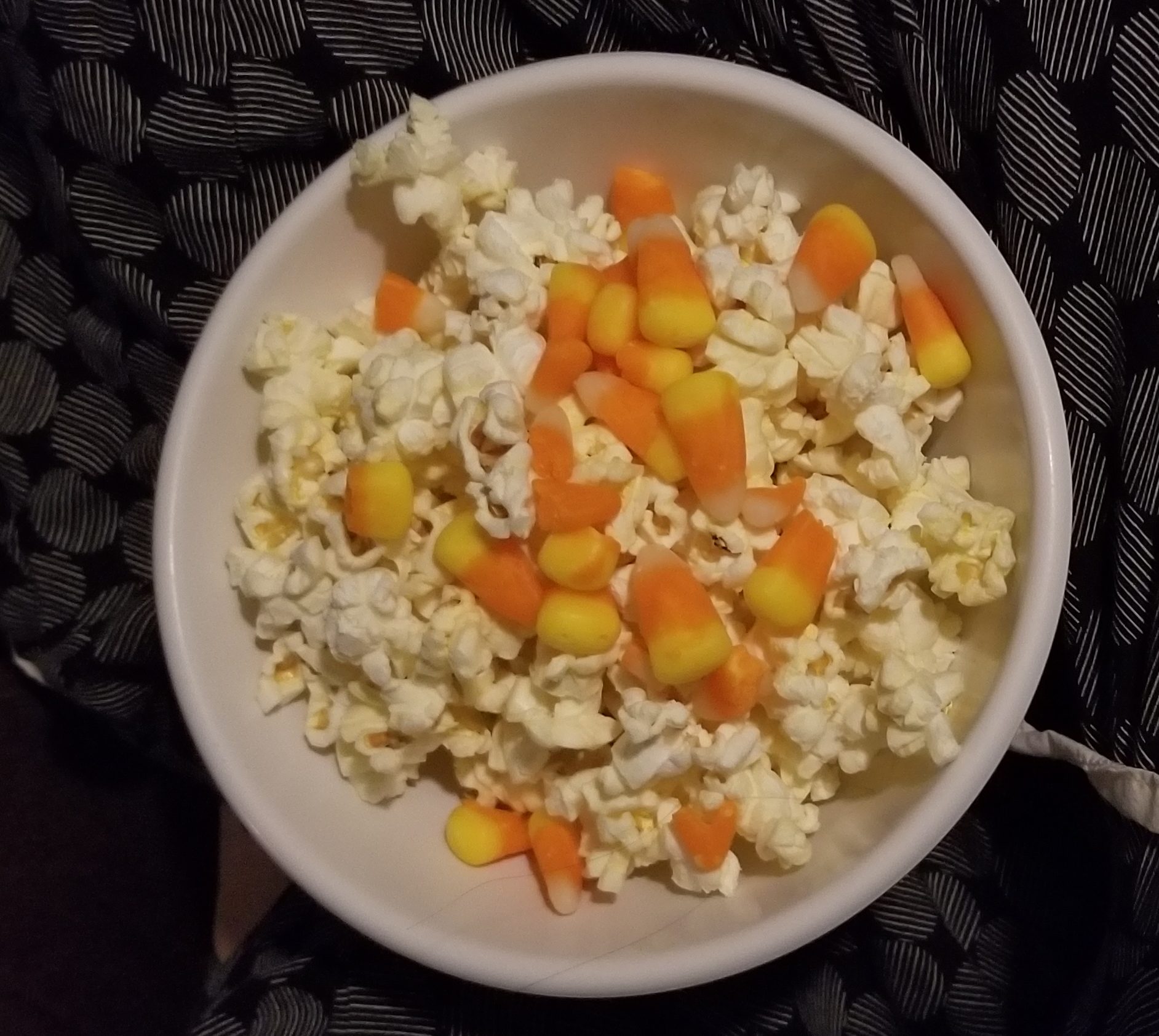 Saturday night, B and I put the kids to bed semi-early so that we could hang out and watch a movie. Have you seen Black Panther? I really enjoyed it. And my snack of choice – popcorn and candy corn!