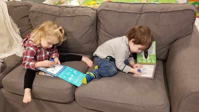 That night, in lieu of our usual Sunday family dinner, we had dinner with some of B’s friends. They all have kids, and FW adores one of them, Celia. They had a great time playing.