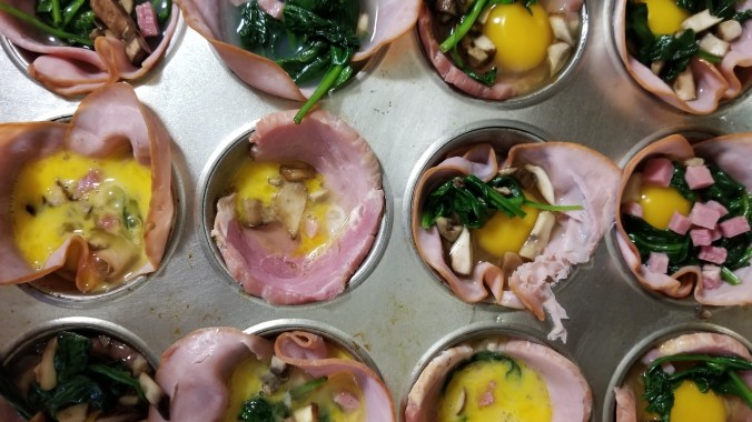 I made some egg cups for quick breakfasts. B is back on slow carb, so I’m trying to find easy breakfast that don’t involve bread, etc. for him.