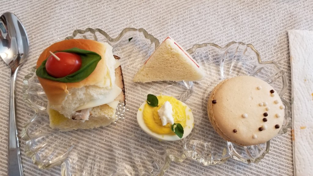 And of course, there were treats. In addition to tiny tea sandwiches and deviled eggs, there were macarons. Mine was so so good.