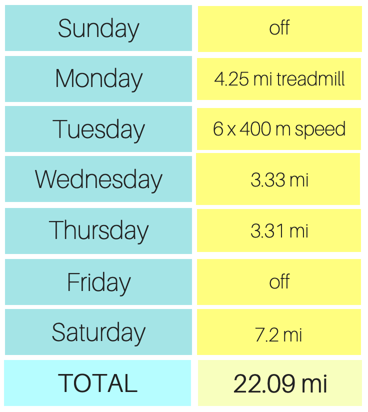 The week called for off days on Thursday and Friday, and then a 5k race on Saturday. I didn’t have any races planned, so I opted to get in a long run Saturday instead (and still get out for a short run Thursday … it was 55 degrees when I came home from work — I had to!). So here’s what the week looked like: