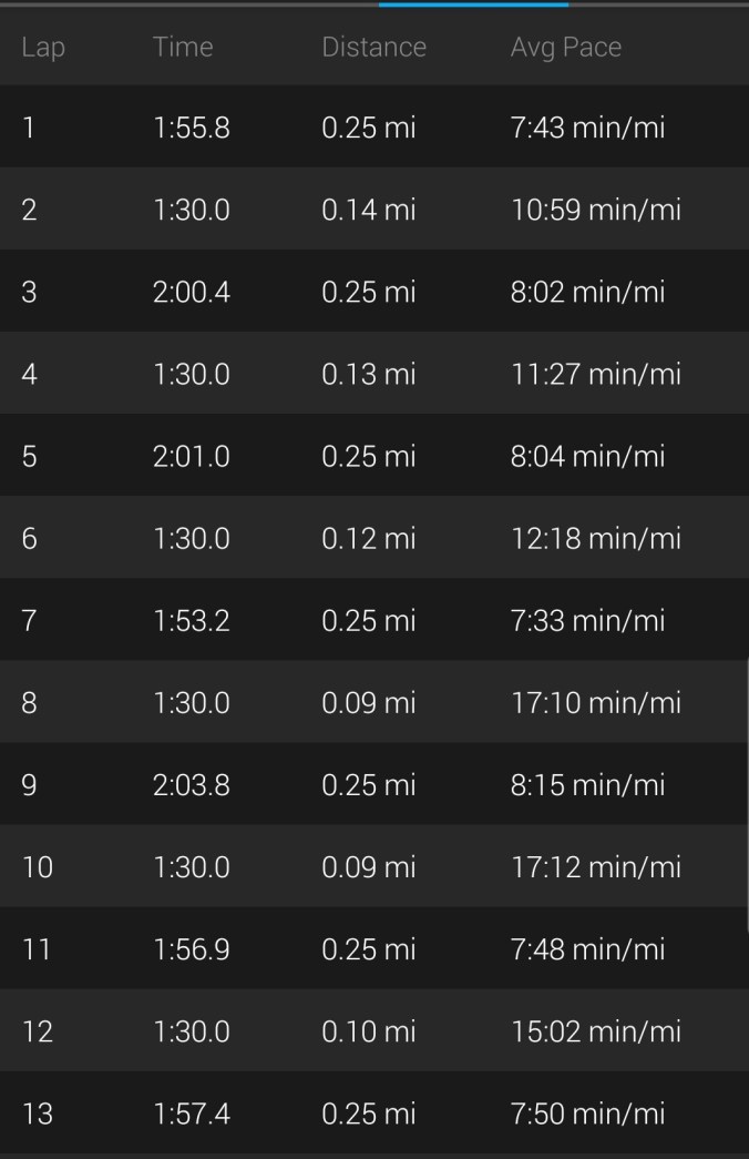 This week was the first time that I used my Garmin Fenix to help with interval training. I typically do speed work inside on a treadmill, but I opted to try it outside, since it was 50s in the morning. It was actually kind of fun to do my intervals outside – my only issue was that some of the runs were uphill and some were downhill. But I guess that is good for training in real world conditions?