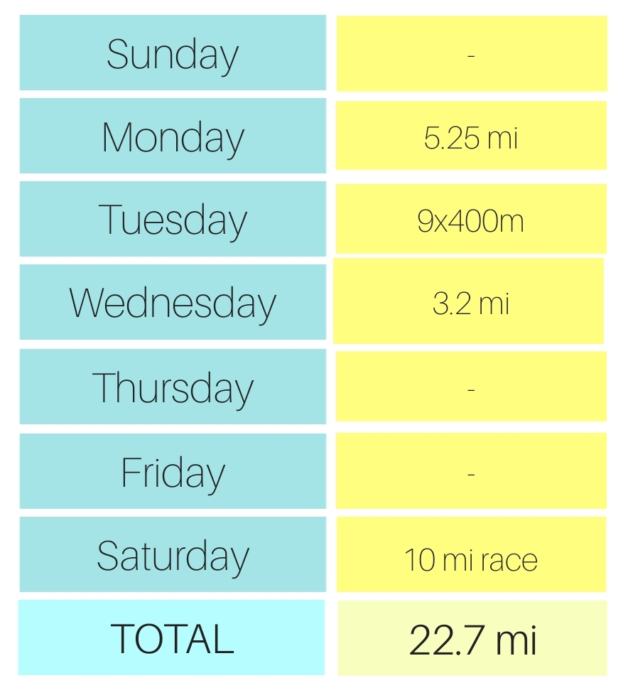 Here’s a look at week 9 of my Cleveland half marathon training. Way fewer miles than last week, but it did include a pretty good interval run, plus a GREAT 10 mile race where I PRed!