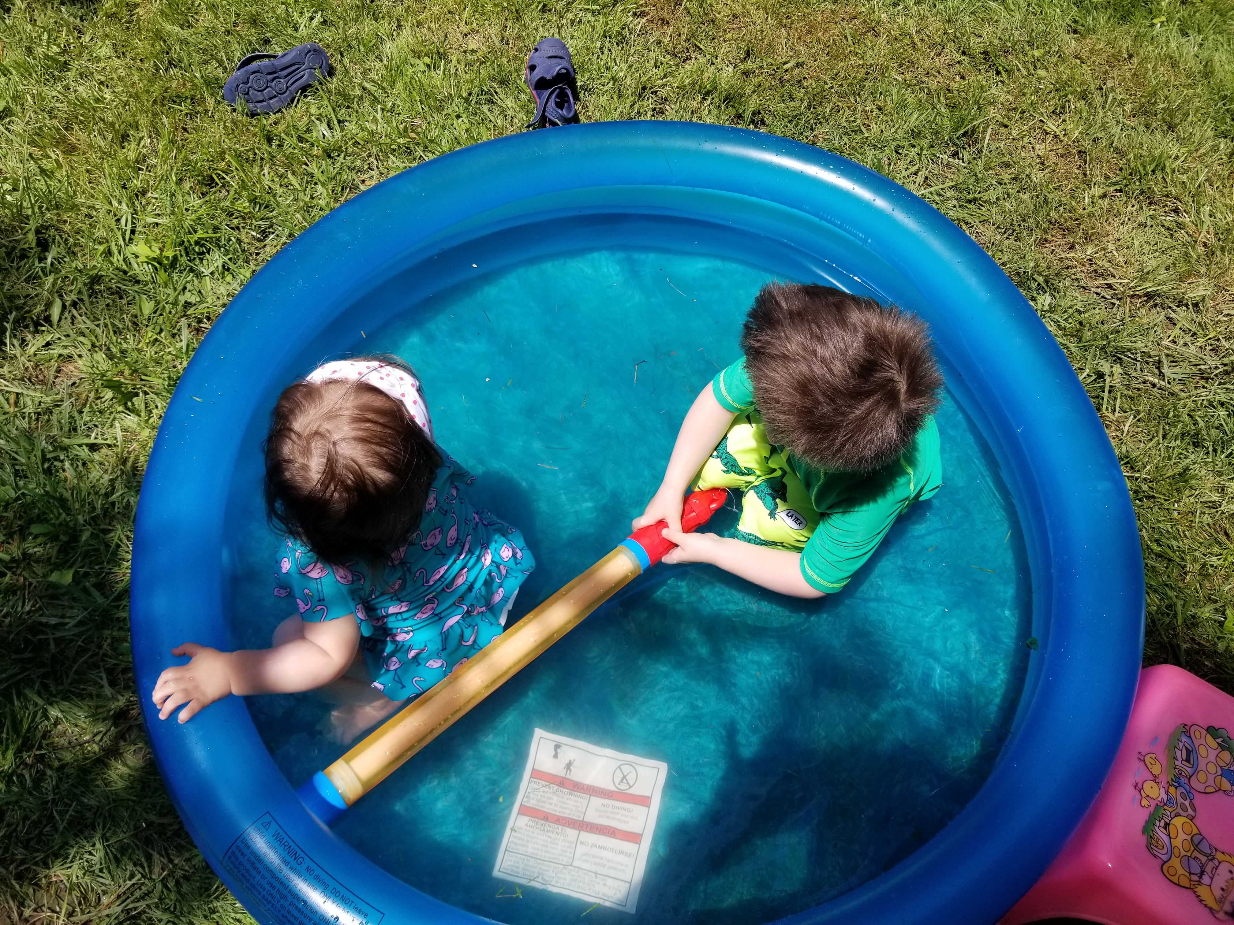 Especially on Saturday. It was HOT so we spent most of the day like this. We had a birthday party to go to (Actually, it was a half birthday party) and luckily there was a pond to relax in and plenty of water toys.