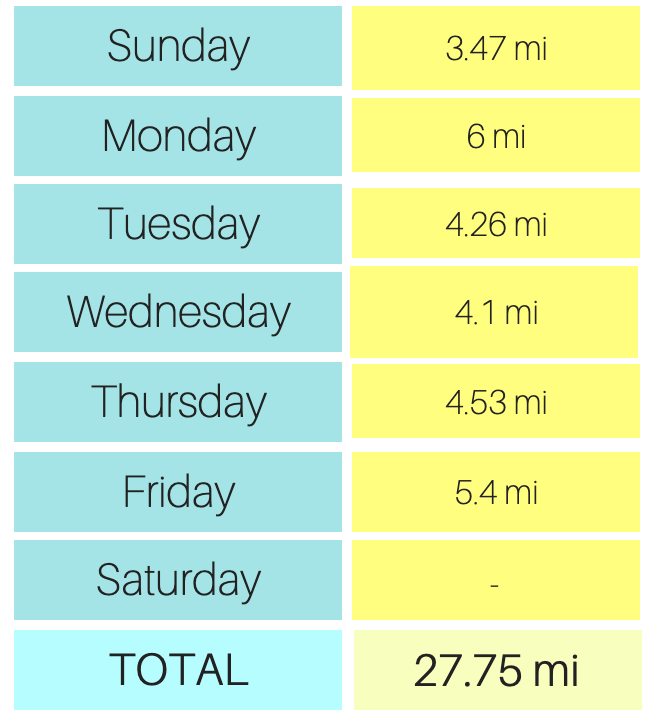After last week’s high mileage week, this week was a little less. I started the week off with a cold. Sunday night into Monday I started getting stuffy, which then turned into a head cold. I still was able to get in runs, but was tired and didn’t get in as much mileage as I used to.