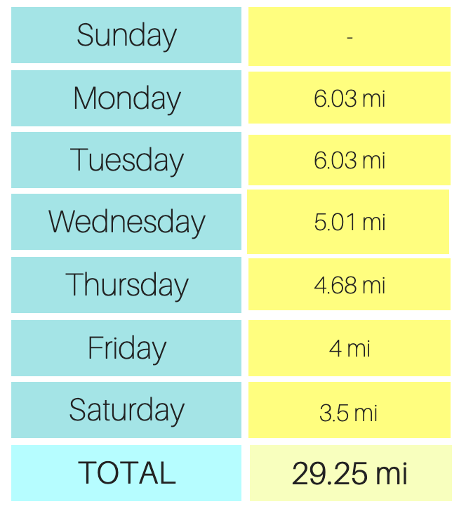 This week, I ended the up with 29.25 miles.