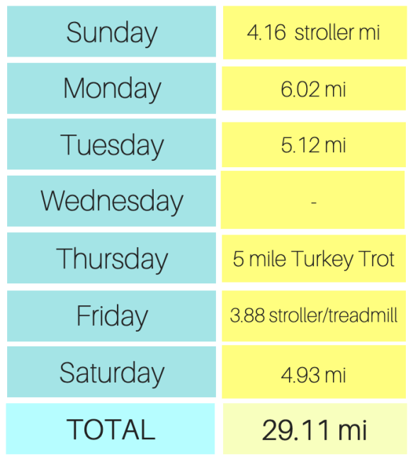 Hope you had a great Thanksgiving! Thanksgiving week here ended up being pretty good in terms of weather most days, which meant almost all my runs were done outdoors AND B and I got in a Turkey Trot. I ended the week with just under 30 miles total.