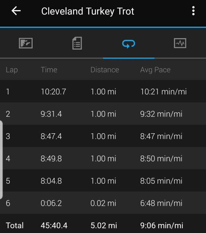 On Thanksgiving Day, B and I ran in our local Cleveland Turkey Trot. They have a 5K and 5-mile race, and I did the 5 mile which my parents watched the kids at home. It was WINDY out (the wind was 25-35 mph winds with gusts much higher) and I’m glad we didn’t end up bringing the strollers and running with the kids.