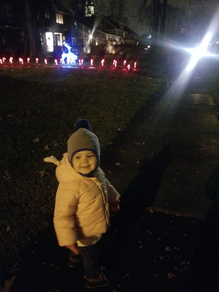 It finally stopped raining in the afternoon, so after dinner — our favorite pizza AND my first Christmas Ale of the season! — we went outside for a walk to check out some of the holiday lights.