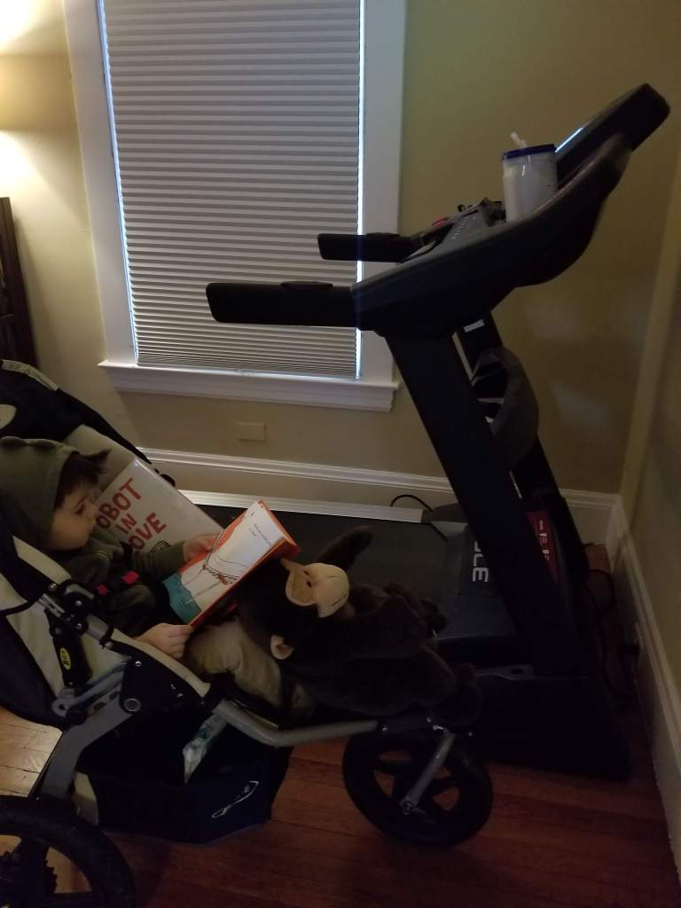 Sunday morning included a treadmill run. FW usually goes with my on stroller runs, so for part of my time on the treadmill, he decided to sit in the stroller next to me, which I found adorable.