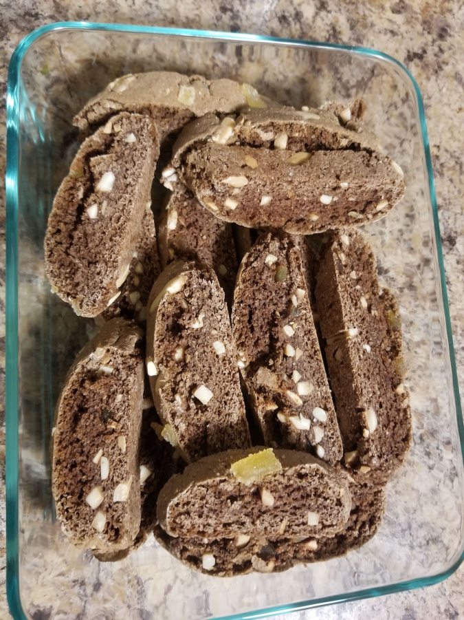 We also baked some biscotti! This is B’s favorite – ginger chocolate almond – and they’re his mom’s recipe that I’ve tweaked somewhat and may ned to share someday.