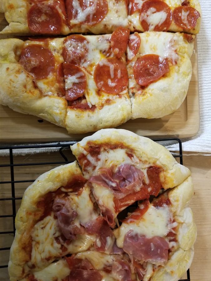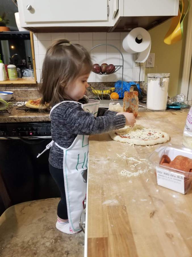 We (B and LM) made pizza! We were supposed to have friends over for dinner Saturday night but they got sick, so we ended up just having an indoor pizza night.