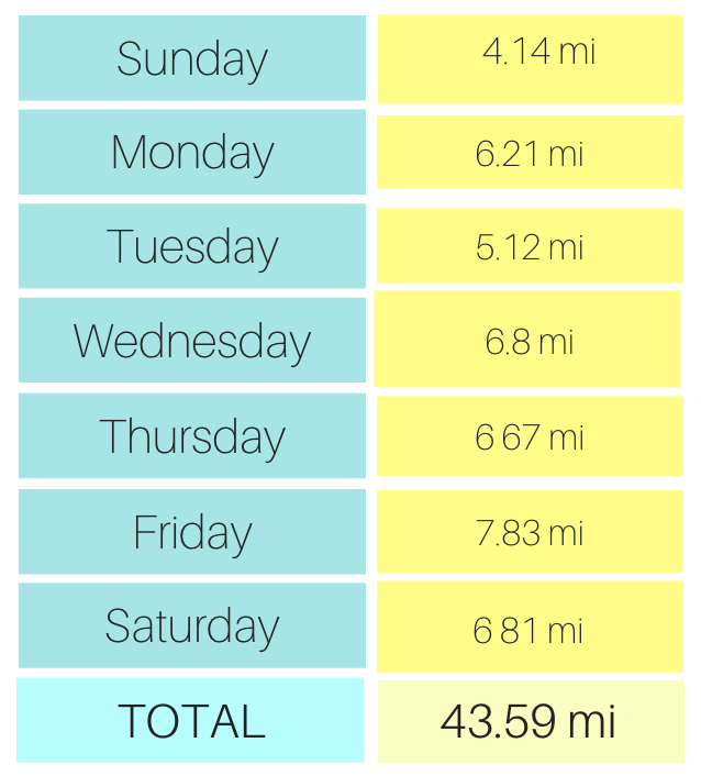 Here is a look at this week’s mileage. I was once again at 40+ miles for the week and got in a run each day.