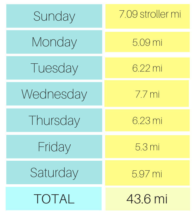Sunday, I got in a stroller run/walk with LM! We did 7 miles, which is more mileage than I’ve ever done with a stroller! It wasn’t all a run – I did a lot of stopping to entertain her, give her food, get books, get her more water, and even go into the house to get a new book and rain boots for her as it started raining halfway through the run.