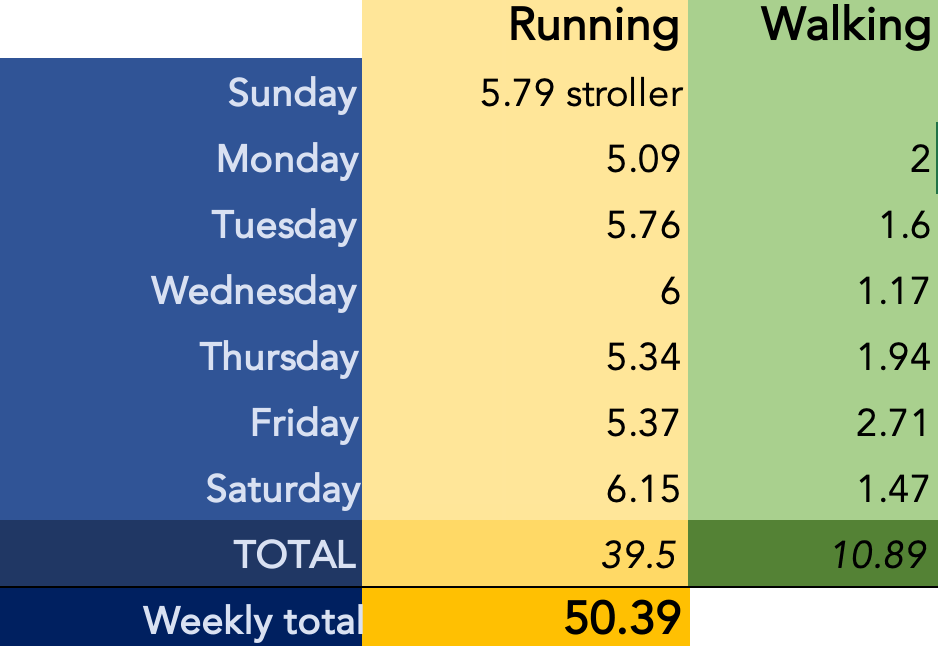 This week I got in some good miles – walking AND running. I’m still having some pretty bad plantar fasciitis issues with my left foot and I’m trying to roll it out on an icy water bottle, a golf ball, tennis ball, etc. I massage it and try to wear sneakers around the house. Next up, trying NSAIDs to see if that helps. Anyway, with that, here’s what the week looked like: