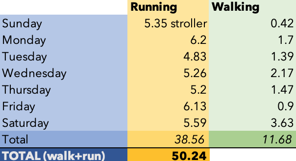 Here’s what the week looked like. I also tried to take some walks each day so, that mileage is included once again.
