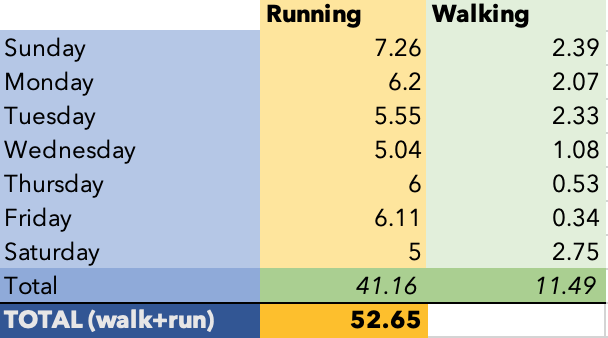 With the cruddy weather I didn’t get in as much walking as usual, but I was happy to have another week of 40+ miles running under my belt.