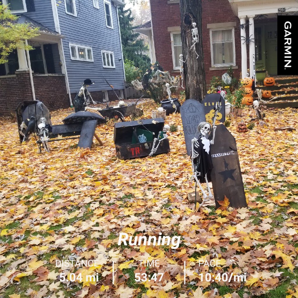 Congrats on your continuing run streak! I love those fall colors. In my neighborhood the tips of some trees have changed, but the rest is green. We had some trick-or-treaters come by — we put candy out on a Halloween platter at the end of our driveway.
