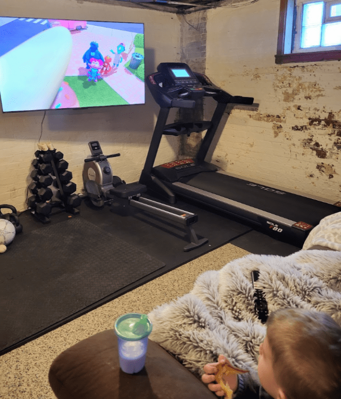 New treadmill location is perfect for hanging out with the little ones while they watch TV