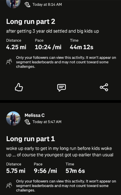 Leg day followed by running must be tough! You’re doing a good job with keeping up all those workouts. I think a long run is a long run even if it’s split up, especially if it’s on the same day.