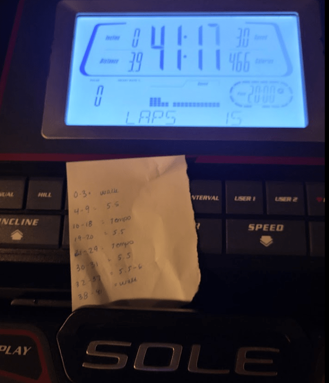Tuesday: 35 minute tempo run and cool down walk for 4 miles total, plus 2 miles treadmill walking, finish back and bicep workout and start leg workout, DR ab exercise. e and 1.9 mi walk at lunch – It was back to school and back to work, so another early day. I finished my back/bicep workout, started the leg workout, and got in my speed workout – a 35-minute tempo run! I had to write down my goal of what to do on a sheet of paper and put it on the treadmill. It wasn’t fun but I was glad to get it in.
