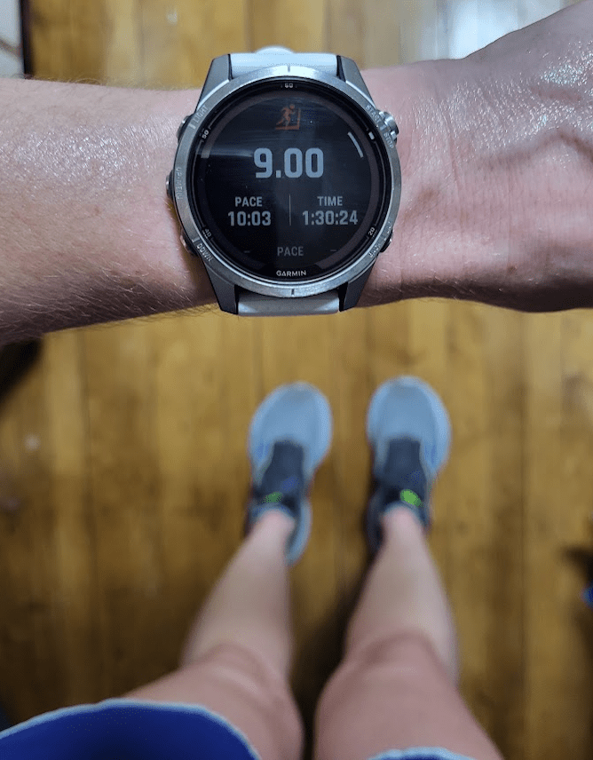 Monday: 4.11 outdoor miles, finished shoulder and leg workout, DR core, start of back and bicep workout, 1.25 miles walking on the treadmill