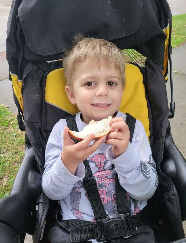 I once again felt like I wanted to brave the dark and get in a walk outside. About 1.5 miles in, it started POURING, so I ran home. The .5 miles I ran slowly, but I didn’t stop the entire time! Hopefully my hip won’t suffer from that. Later it stopped, so GM and I got in a stroller walk for bagels after the big kids went to school. Having the big kids off to school by 7:15 means I have some 1:1 time with GM before I work!