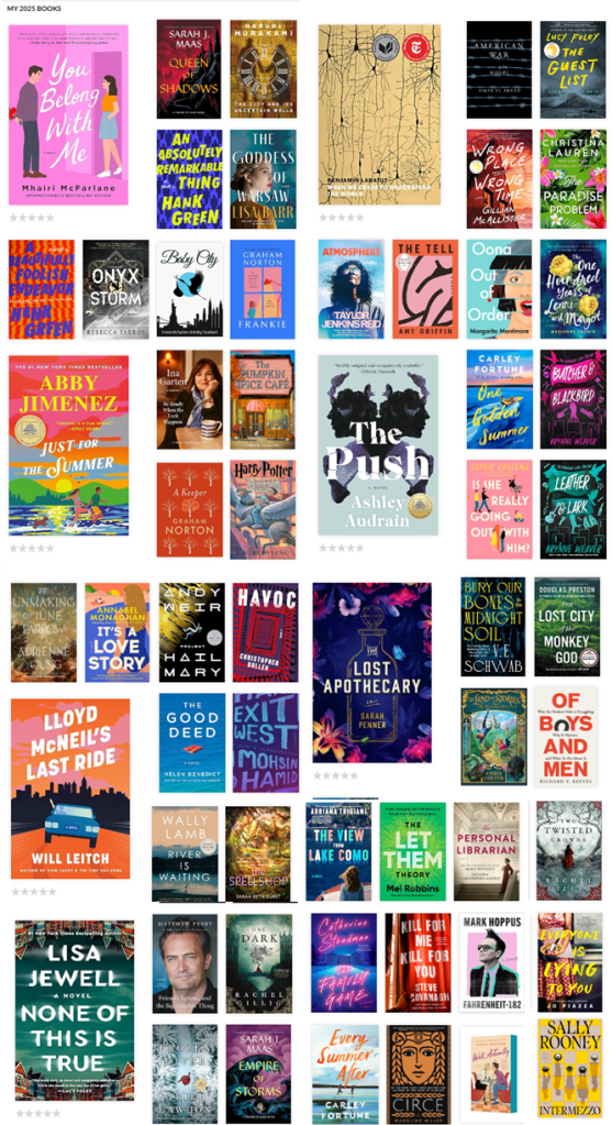 Happy end of 2025 reading summary! And what a year it was for books. Last year, I read 60 books – and this year I JUST beat that with 63! Woohoo! I had a great year in terms of reading, with a wide variety of books – nonfiction, fiction, romance, YA, thrillers, historical fiction, memoirs, self-help etc. Thanks to Goodreads, I know that I read 24,000+ ages this year and the average book length was 193 pages AND the longest book I read was 733 pages!