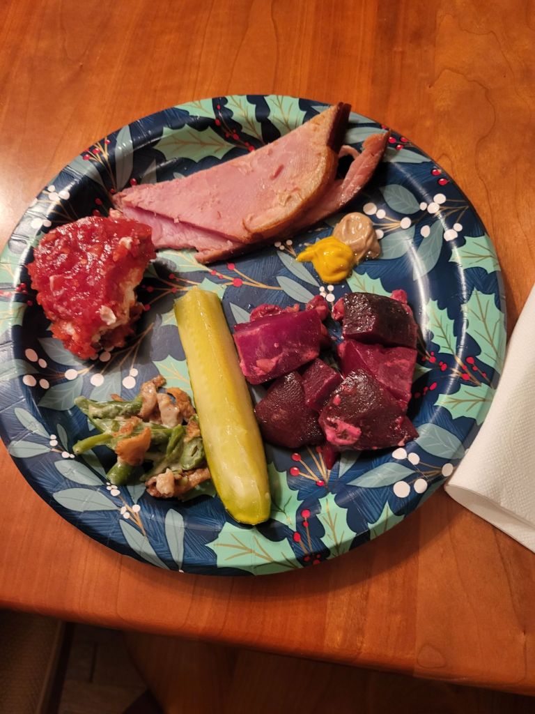 That night was dinner at B’s parents’ house and they had a belated Christmas-type meal. Ham and jello “salad” – have you ever had jello salad before? I’d never heard of it until moving here, but it’s a staple now and B’s mom usually makes it 1-2x a year. (It’s the red stuff- and no, it’s not actually a salad) Note – I’d also never had green bean casserole until moving to Ohio but I think it’s more than an Ohio thing.