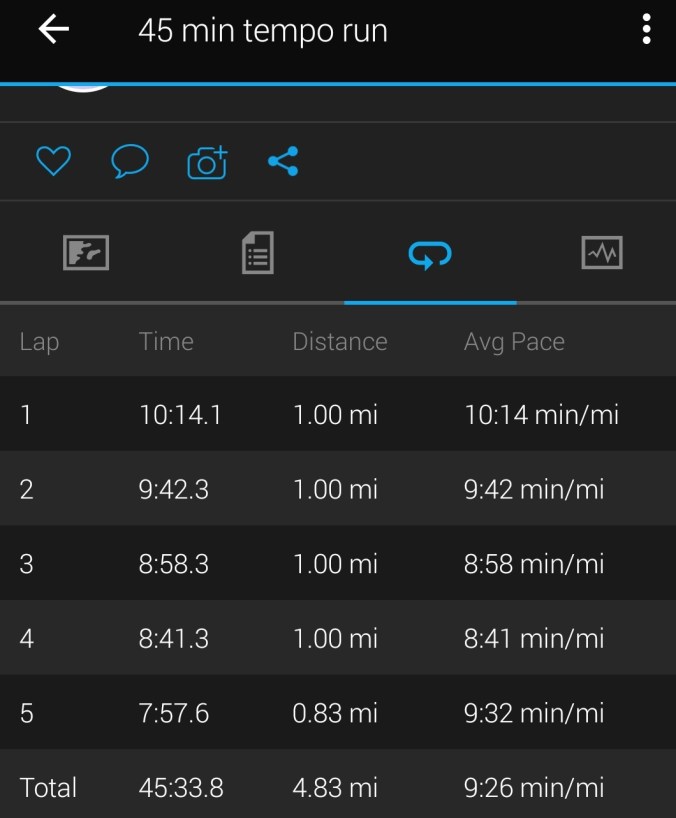 Mileage-wise, it was a good week. I got in 30+ miles for my total, including a 10 miler (which was done before work on Thursday). But overall, I didn’t feel great/strong/fast during most of these runs. My tempo run was done much slower than the runs of the previous weeks. My 10 miler had some of my slowest miles in some time. And I was due for a 5 mile pace run, and I only made it 4.5 mi very much NOT at pace (confession – I did stop early due to a screaming baby, but she had no effect on my pace).