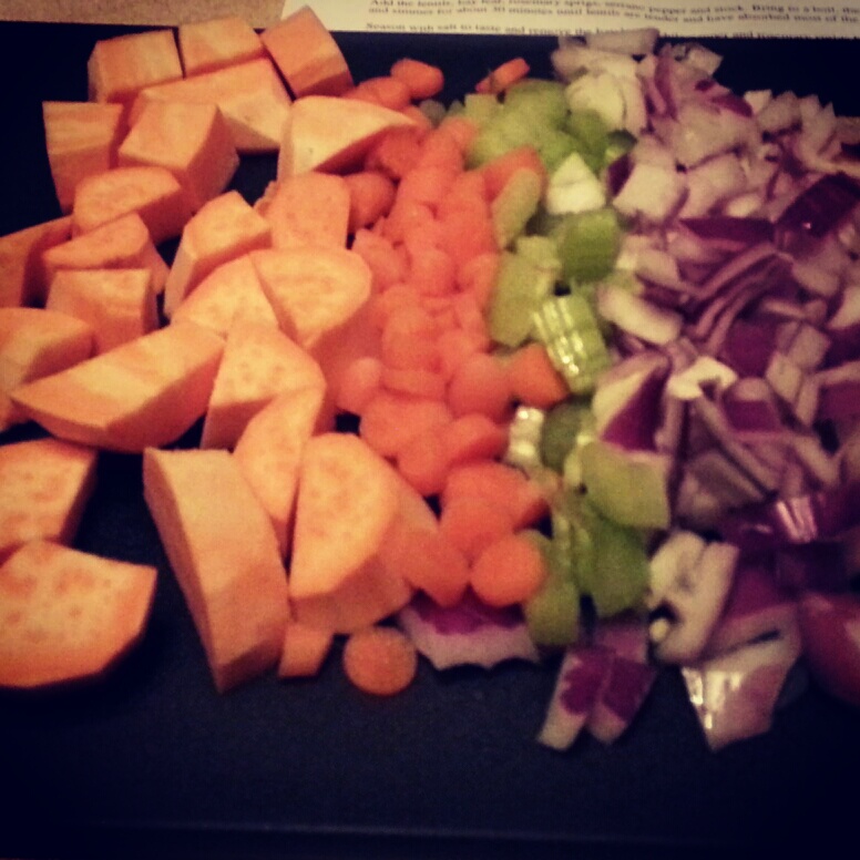 - Dice the onion, celery, serrano peppers and carrots. Chop up the sweet potato into 1/2 inch cubes.